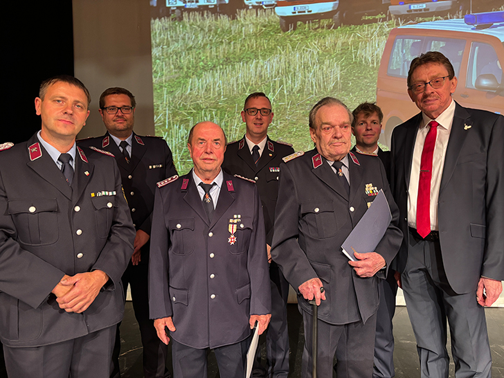 Kameradinnen und Kameraden wurden zu verschiedenen Dienstjubiläen geehrt. Die Ehrenmedaille des Kreisfeuerwehrverbandes Vogtland in Silber erhielten für ihren Einsatz Kamerad Daniel Krauß, langjähriger Jugendfeuerwehrwart der Jugendfeuerwehr Reichenbach, Kamerad Steffen Blank, Kreisausbilder für Motorkettensägenführer und Ortswehrleiter der Feuerwache Reichenbach sowie Kamerad Bernd Labus, seit 20 Jahren Kreisausbilder für Maschinist Löschfahrzeuge. Stadtwehrleiter Thomas Weck wurde für seine Verdienste, er ist seit 1997 aktives Mitglied der Freiwilligen Feuerwehr Reichenbach, mit der Ehrenmedaille in Gold geehrt. Ausgezeichnet wurden auch die Förderer und Partner der Feuerwehr. – Fotos Silber + Gold + Förderer und Partner