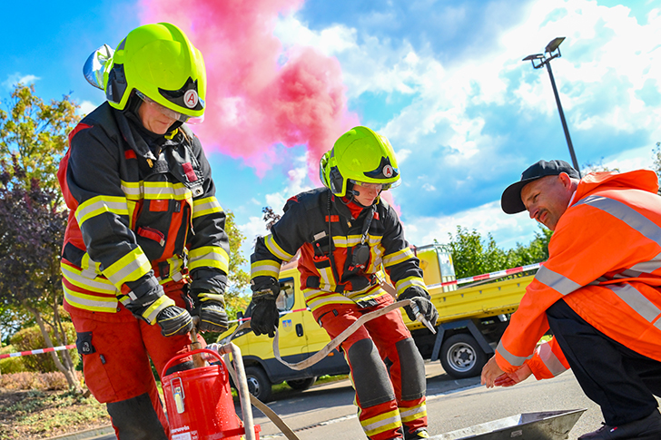 Beide dankten den Kameradinnen und Kameraden für ihren Einsatz sowie den Förderern und Partnern der Feuerwehr – also Unterstützern und den Arbeitgebern, die das Feuerwehrengagement ihrer Mitarbeiter mittragen. Ein Grußwort überbrachte der Abteilungsleiter für Bevölkerungsschutz des Sächsischen Staatsministeriums des Innern, Andreas Hirth. In einer Interviewrunde sprachen OB, Kreisbrandmeister, Stadtwehrleiter und der Gemeindewehrleiter von Heinsdorfergrund zum Thema Feuerwehr und Katastrophenschutz.