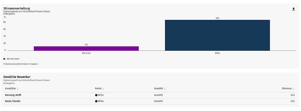 Die Ermittlung und Feststellung der Wahlergebnisse erfolgt in der nächsten Sitzung des Gemeindewahlausschusses am 28. Oktober 2025, um 15:00 Uhr im Ratssaal, Markt 1 in 08468 Reichenbach im Vogtland.